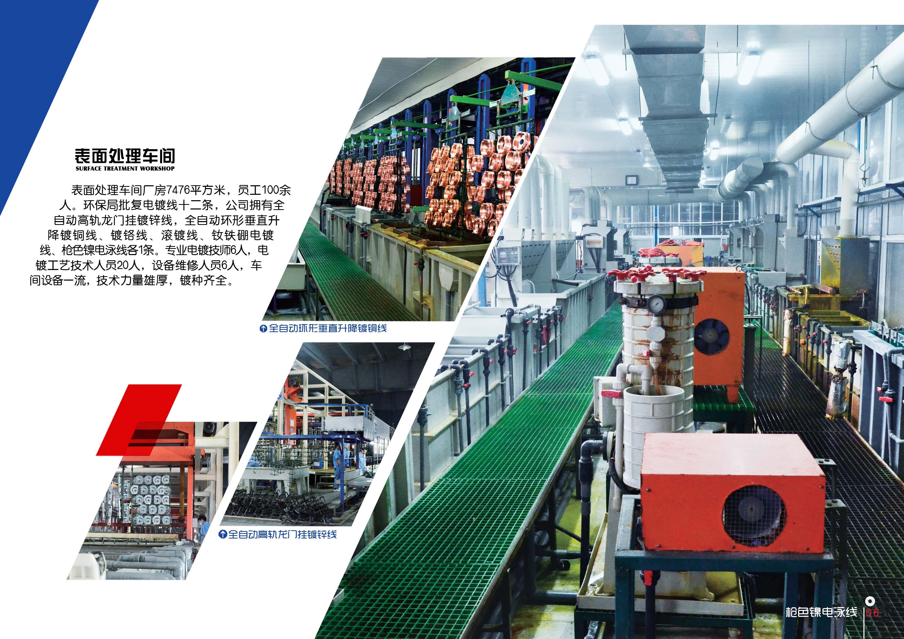 表面处理车间员工84人,电镀技师3人。2014年镀铜班荣获省级”优胜班组”称号,车间年产值2500万元,各类电镀产品达30种,主导产品如:凯邦电机端盖、理士电池端子、航嘉电源机壳、美的电控盒、奥克斯Y电控盒等。产品镀铬工艺采用二次镀铬技术,达到国内领先水平。车间龙门镀锌、挂镀锌、ABS镀铜自动生产线大大提高了产品产量和质量。各条电镀生产线利用吸风喷淋、吸收铬雾、氨氮等技术;排污水采用多道逆流清洗,污水浓度大大下降,节约了环保处理成本,提高了环保性能。