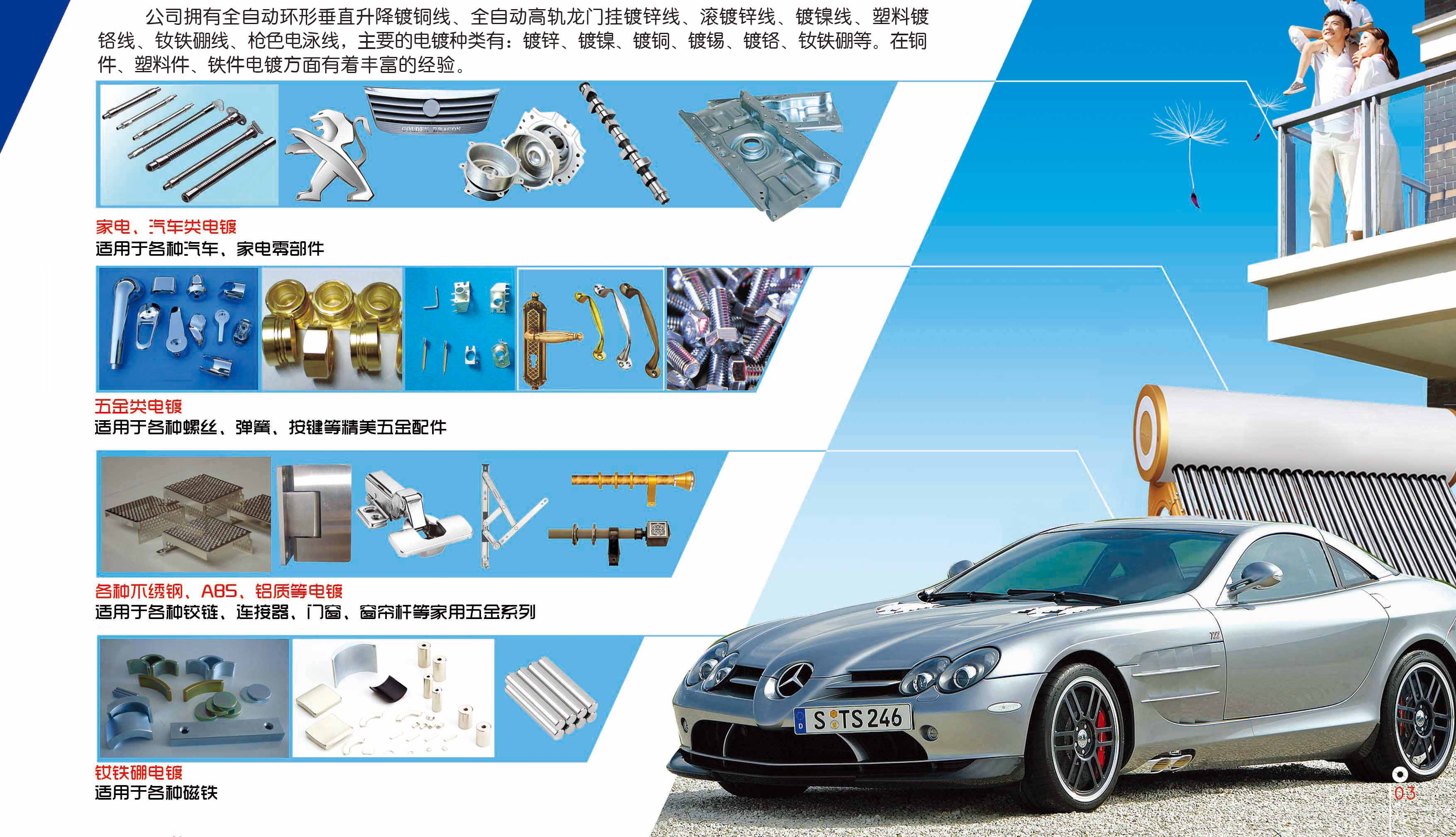公司拥有全自动环形垂直升降镀铜线、全自动高速龙门挂镀锌线、滚镀锌线、镀镍线、塑料镀铬线、钕铁硼线、枪色电泳线,主要的电镀种类有:镀锌、镀镍、镀铜、镀铬、镀锡、钕铁硼等。在铜件、塑料件、铁件电镀方面有着丰富的经验。