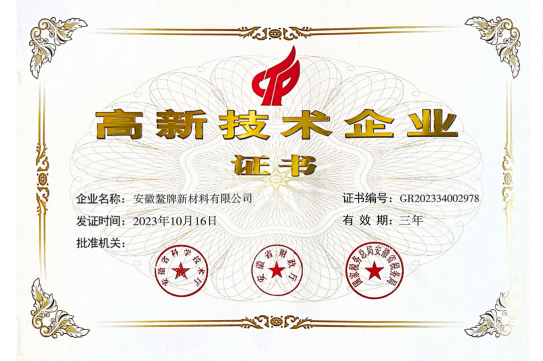 安徽鳌牌公司荣获“高新技术企业证书”