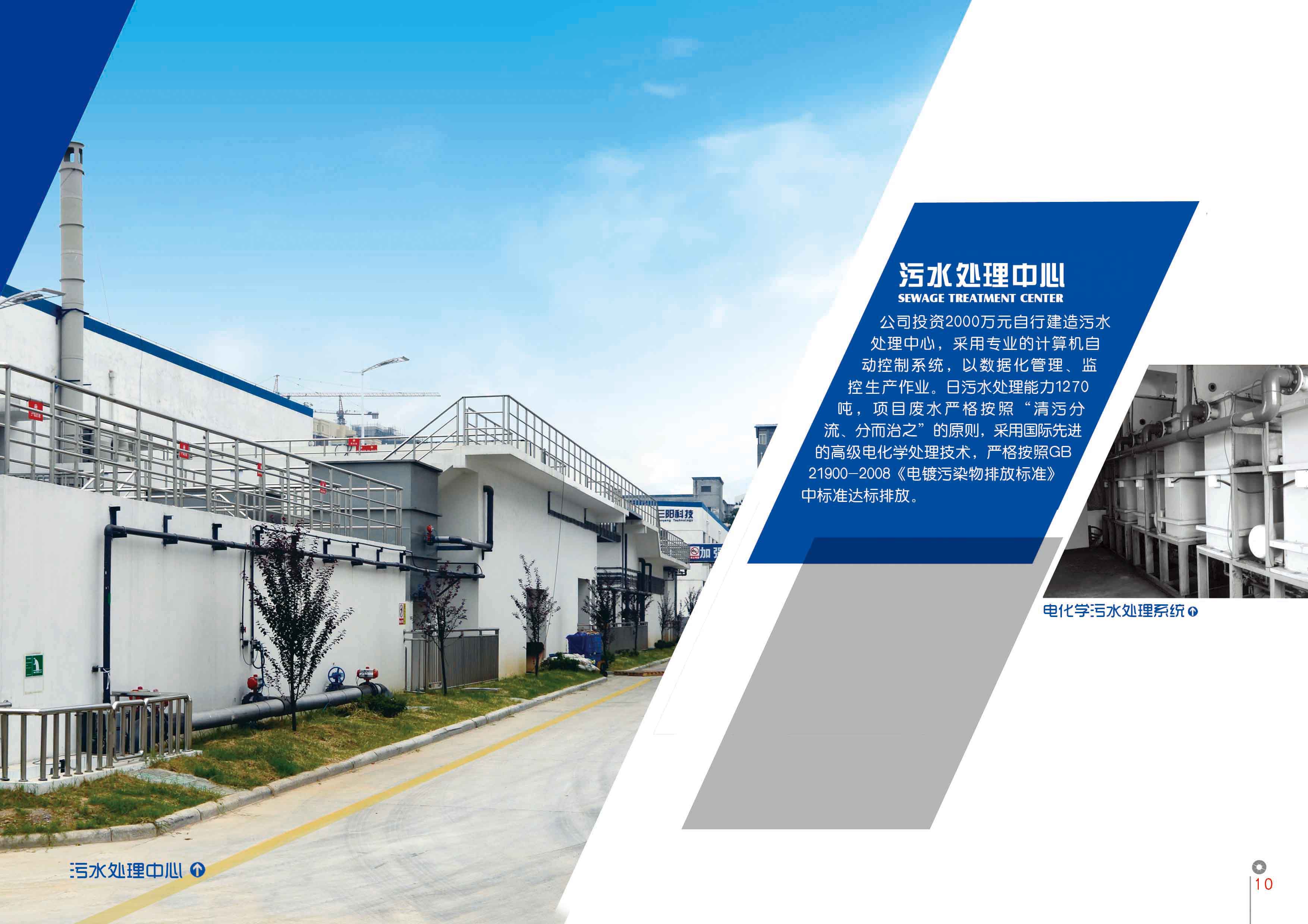 公司投资2000万元自行建造污水处理中心,采用专业计算机自动控制系统,以数据化管理、监控生产作业,日污水处理能力1270吨,项目废水严格按照清污分流、分而治之的原则,采用国际先进的高级电化学处理技术,严格按照GB21900-2008《电镀污染物排放标准》进行达标排放。